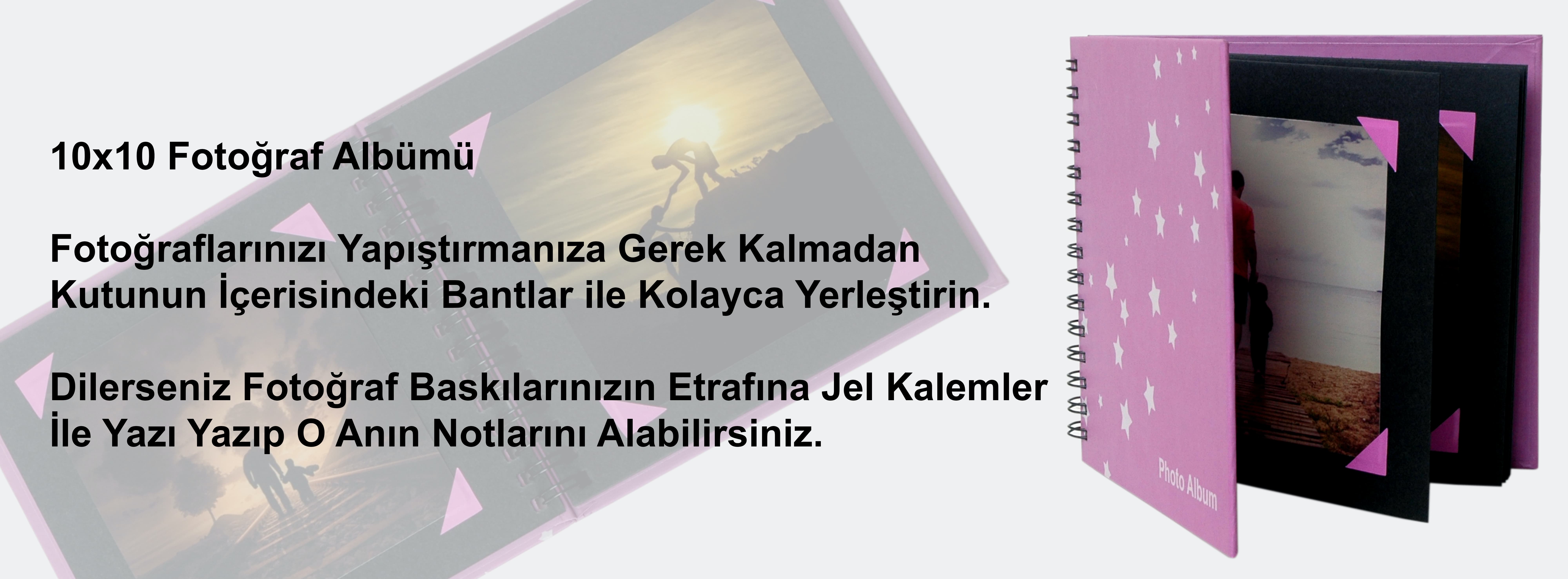 20 Adet 10x10cm Fotoğraf Kapasiteli Fotoğraf Albümü.Kutunun İçinde Sticker Bant Bulunmaktadır.Sticker Bantlarla Fotoğraflarınızı Albüme Yapıştırabilirsiniz.